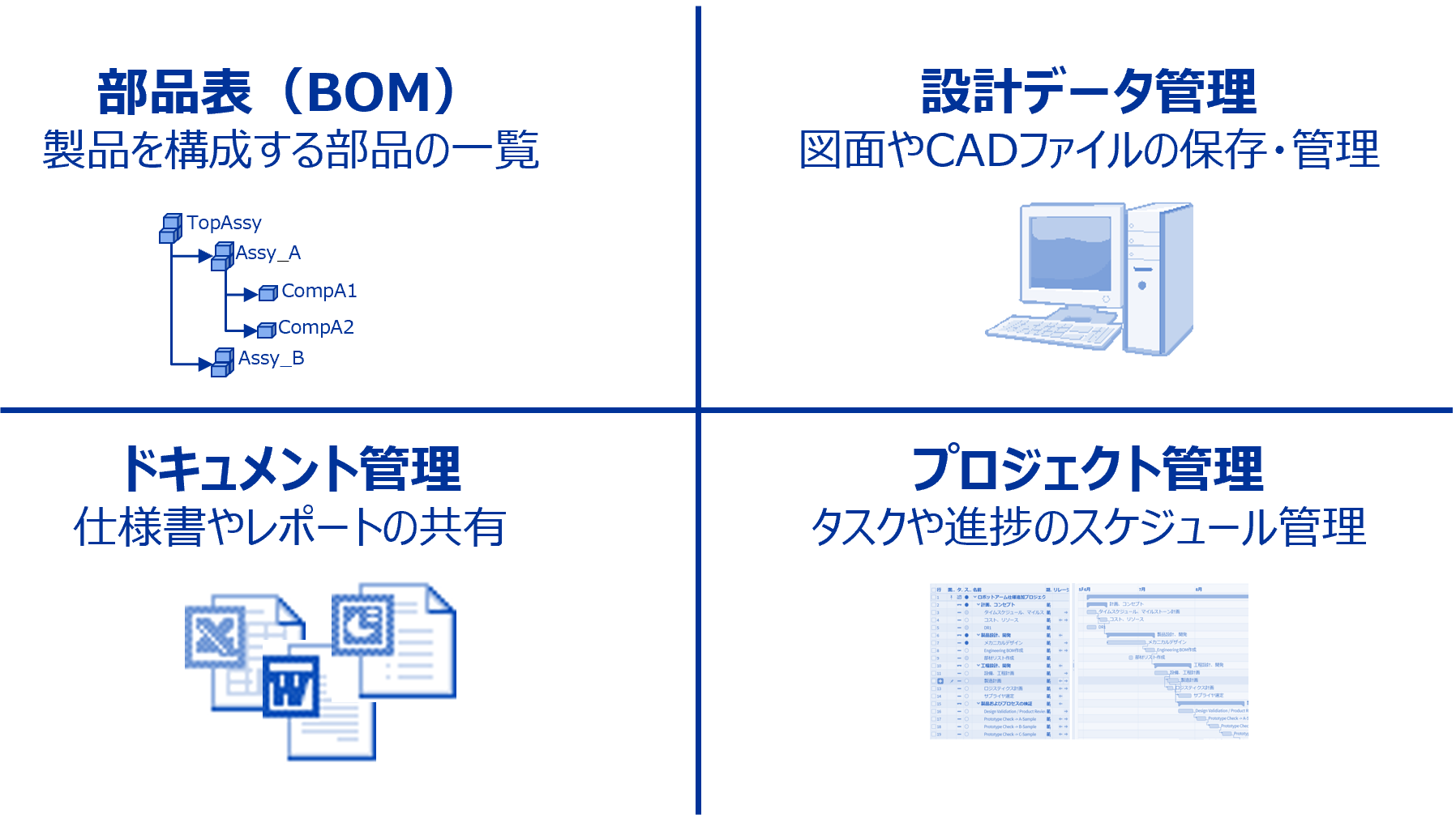 BOMが製品の構造を示し、ワークフローがその製品に関する意思決定の流れを整え、データ管理がそれらの情報を信頼できる資産として支えます。
