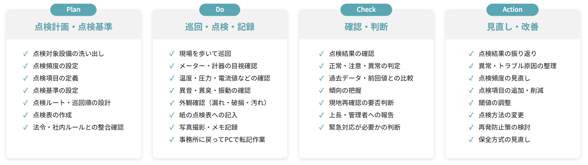 多くの現場では、点検計画や基準に基づき、巡回・点検・記録を行い、確認・判断を経て改善につなげるという流れで設備保全業務が運用されています。一方で、このプロセスを分解してみると、人が関与しなければ回らない作業が想像以上に多いことが分かります。