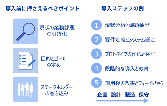 そのため、企画部門やIT部門だけで進めるのではなく、設計や製造など、現場のメンバーを早い段階から巻き込むことが重要です。