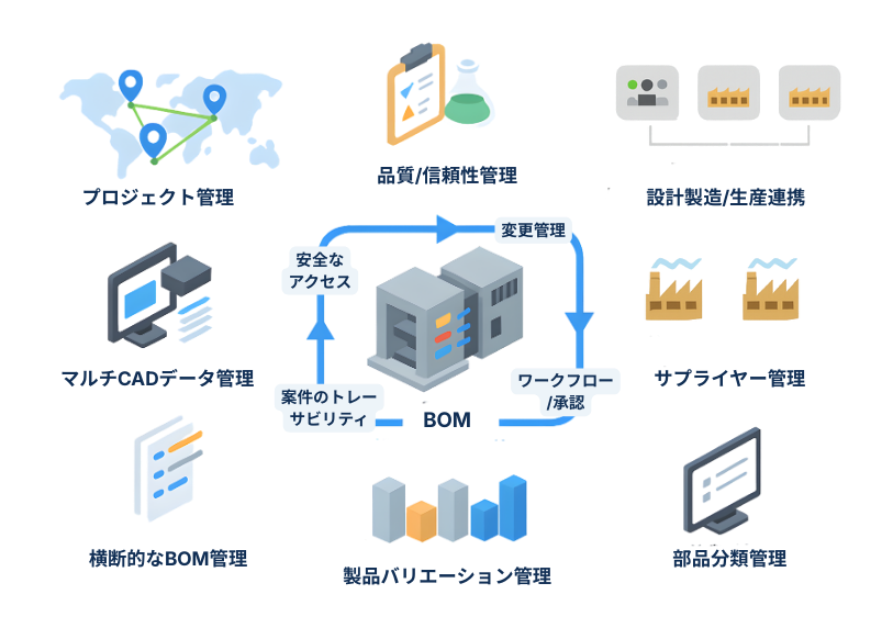 製造業では、設計情報・BOM・現場データなどを分断なく管理し、部門や拠点をまたいで活用できる仕組み作りが欠かせません。