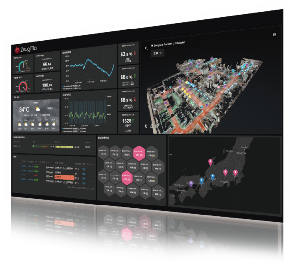 ZeugMaではフォトグラメトリーによって現実空間を撮影し、仮想空間に再現をしています。3DモデルとIoTデータを連携することで、遠隔から稼働状況をリアルタイムに確認できます。